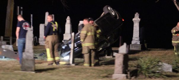 His car went through a guard rail and flipped onto its side, coming to rest in the small cemetery at that location.